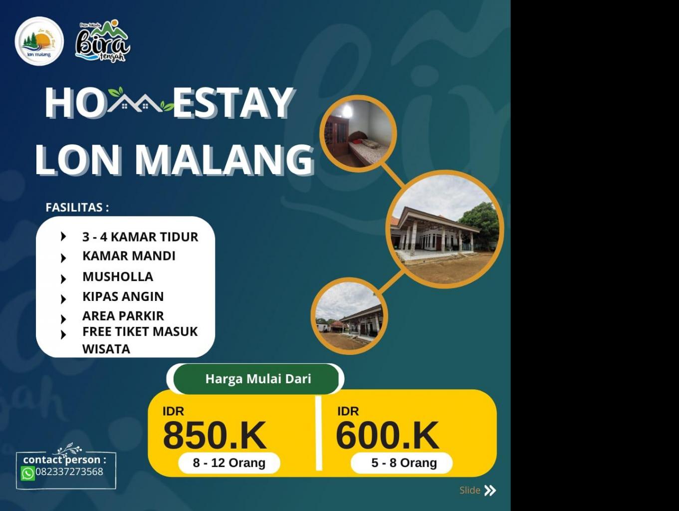Homestay lon malang 2 merupakan rumah milik warga yang dimanfaatkan sebagai orang yang mau menginap di desa wisata bira tengah , memiliki 4 kamar dengan harga 850.000 permalam dengan kapasitas 8 - 12 orang